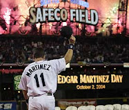 I began to realize Edgar was something special when he won his first batting title in 1992, but like almost everyone, it was 1995 that really sealed the deal. Edgar carried the Mariners that year, particularly after Junior broke his wrist running into the Kingdome's centerfield wall while making a spectacular catch on Memorial Day weekend. Junior would return in August and spark the team to a memorable and historic run to chase down the Angels, but without Edgar's consistent excellence that year (winning his second batting title, hitting a spectacular .356/.479/.628, a 185 adjusted OPS+, with 52 doubles, 29 home runs, 121 runs scored, and 113 RBI in a strike-shortened season), the Mariners would never have been in a position to make that run. I wasn't there for "The Double" - the '95 ALDS Game 5, 11th inning scorcher down the left field line off of Yankees ace Jack McDowell that scored Joey Cora from third and Junior all the way from first base to notch the tying and winning runs and steal the series away from the Yankees - but I was there for the best game Edgar Martinez ever had, the night before. Edgar pretty much single-handedly staved off elimination in that game, digging the Mariners out of a 5-0 hole by hitting a three-run home run in the 3rd, and then hitting a game-winning Grand Slam off of Yankees' closer John Wetteland in the 8th to force that famous Game 5. The Yanks only managed to get Edgar out once in that game, and the buzz his performance created that night has really never subsided in Seattle. I'll never forget walking down the massive concrete ramps in the old Kingdome after that game, hearing the chant "Edddd-gaaar" for the first time, and then over and over and over, never ending for almost another decade.